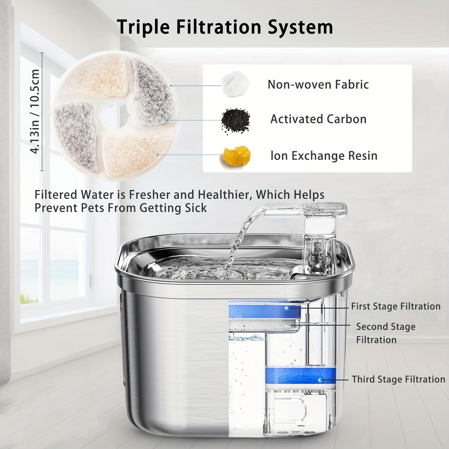 Includes 3 filters to remove hair, debris, and odors for fresh, clean drinking water.