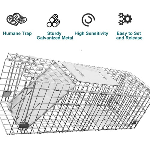 Safely and ethically catch and relocate stray or wild animals with our Humane Live Animal Trap Cage. Designed for small to medium-sized animals like possums, cats, rabbits, foxes, birds, and hares, this cage features a spring-loaded trigger system, smoothed internal edges, and a rust-resistant galvanized steel build.
